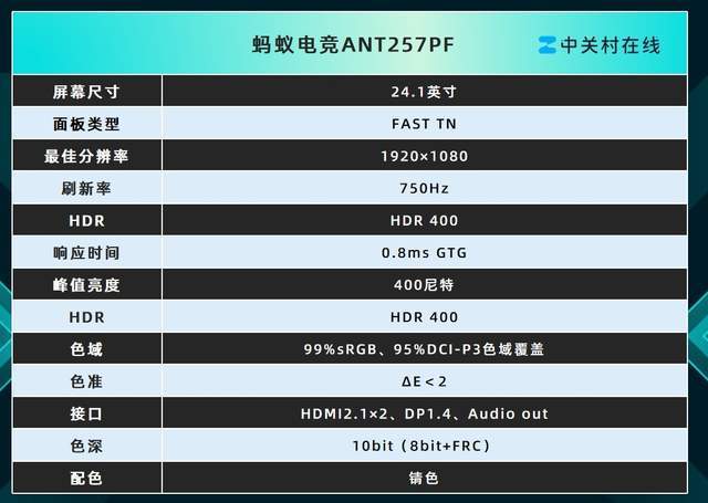 1、750Hz超高刷显示,独领赛事新体验;蚂蚁电竞ANT257PF采用了一块24.1英寸的FastTN面板,支持最高750Hz超高刷新率,搭配0.8ms的疾速响应时间,为玩家带来极致流畅的游戏体验。