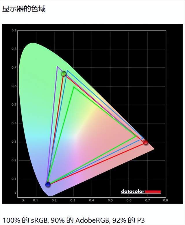 首先是色域测试,根据SpyderXElite软件的测试结果显示,蚂蚁电竞ANT257PF显示器sRGB色域的覆盖度为100%,AdobeRGB色域的覆盖度为90%,P3色域的覆盖度为92%,sRGB色域表现超过官方宣传水平。