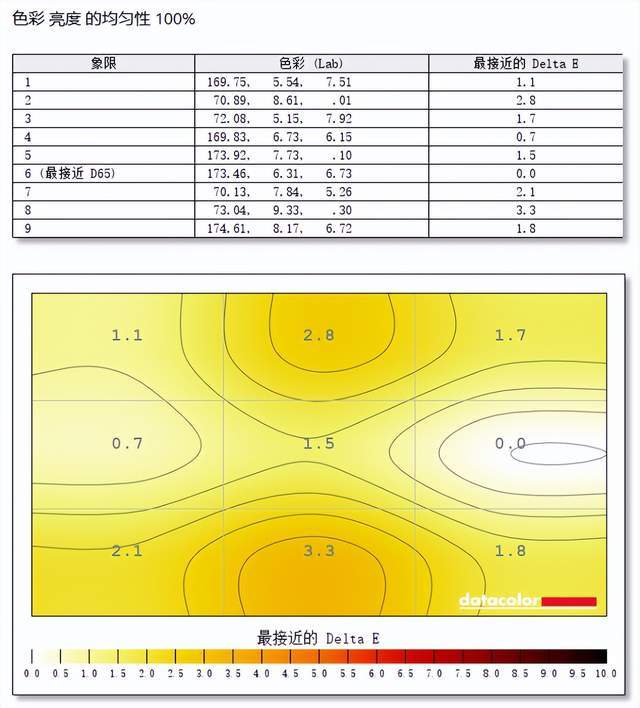在色彩均匀性的测试中,蚂蚁电竞ANT257PF显示器的第6象限最接近D65的标准,显示器中间第8象限与标准色温差值最大,不过也只有3.3,整体色彩均匀度表现非常不错。