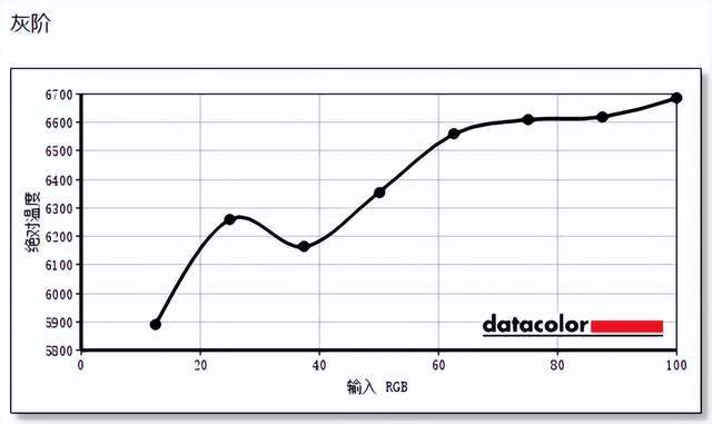 灰阶方面,显示器在全亮度下表现十分稳定,色温维持在5800-6700K之间,色温较为接近标准。