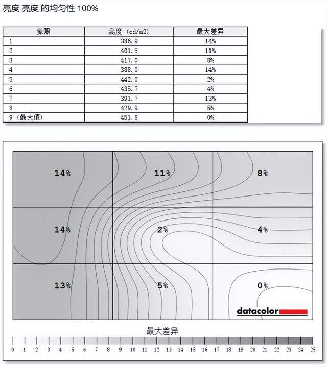 亮度均匀性的测试中,蚂蚁电竞ANT257PF显示器整体表现也还不错,亮度最大为第9象限,最大差异在第1象限,差值为64.9cd/m²。
