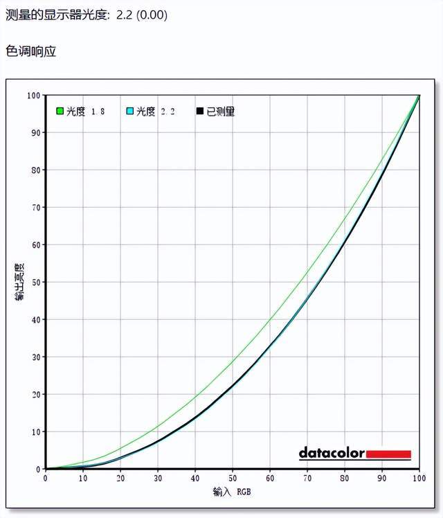 色调响应方面,已测量的黑色曲线应该尽量和浅蓝色的“光度2.2”曲线保持一致,可以看到实测的黑色曲线”差距较小,色调响应表现不错。