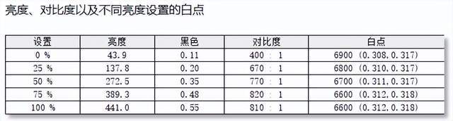 在色温一致性方面,蚂蚁电竞ANT257PF的色温随着亮度上升下降,白点色温稳定处于6600K-6900K之间,实测最高亮度441。