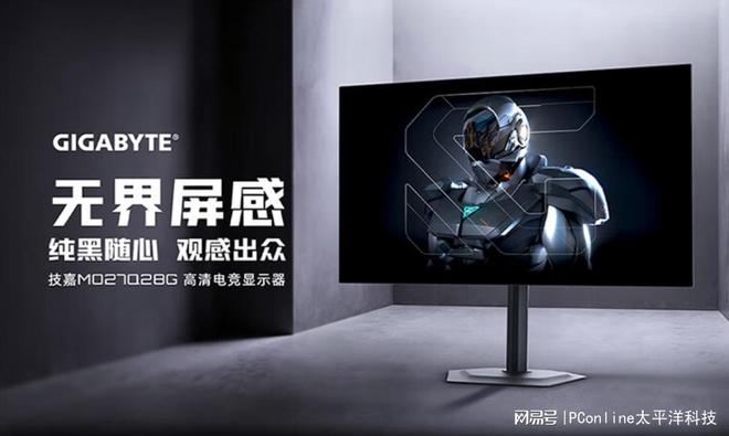 除此之外,技嘉MO27Q28G显示器的外观设计也非常在线,其延续了品牌一贯的简约风格,但在细节上透露着高端感。显示器整体采用黑色调,面板区域极薄,仅几毫米厚,宛如一张悬浮的画布。底部边框稍宽,印有GIGABYTE的LOGO,简洁而不张扬。