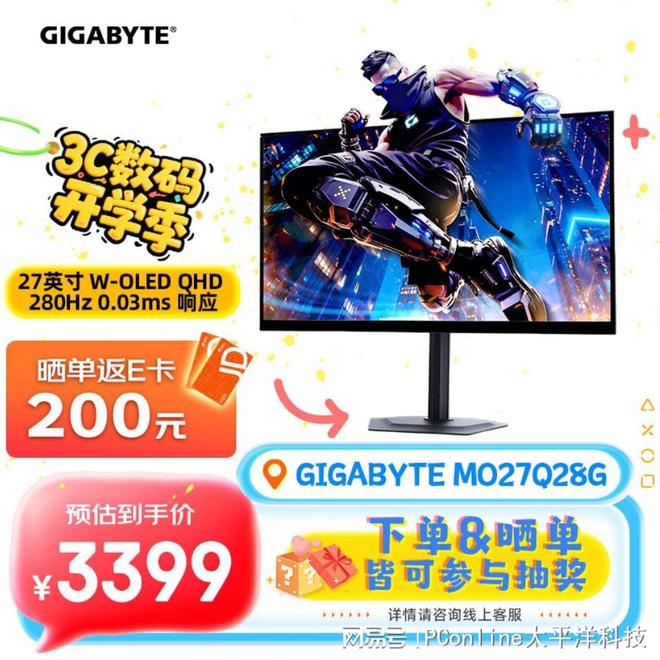 总的来说,现在正是入手技嘉MO27Q28G的最佳时机!目前京东平台预估到手价3399元,结合开学季活动,下单及晒单皆可参与抽奖。晒单还可返200元E卡,实际到手价格将更低。活动时间:2025年9月1日至2025年9月30日。同时得益于技嘉出色的售后保障,这款显示器还提供三年质保,可以说是目前性价比相当高的2K高刷OLED显示器。